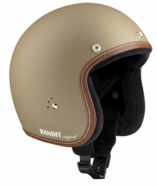Premium versjonen av Jet hjelmen har en beskyttende skinnkant med hvit søm langs hjelmen og en vintage Bandit logo trykket på siden av hjelmen