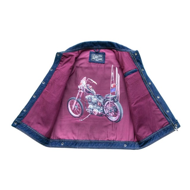 Utført i klassisk blå denim farge med burgunderfarget sateng innerfór, med trykk av Rain Splitter chopperen.