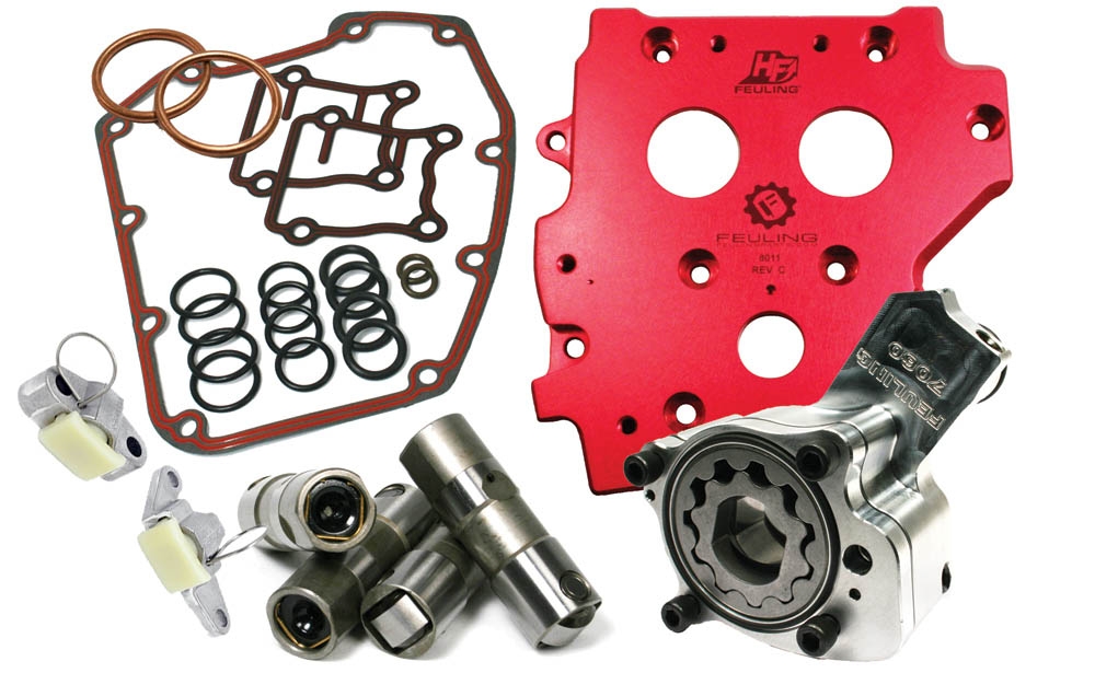 Kamplatesett med Feuling High Flow Kamplate, Feuling HP+ løftere, Feuling HP+ High Flow oljepumpe og hyrauliske kamkjedestrammere.