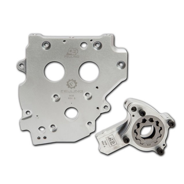 Feuling OE+ oljepumpe og kamplatesett er en oppgradering av det originale smøresystemet og gir økt oljetrykk og returvolum fra en Feuling OE+ billet oljepumpe og tilpasset Feuling OE+ billet kamplate.