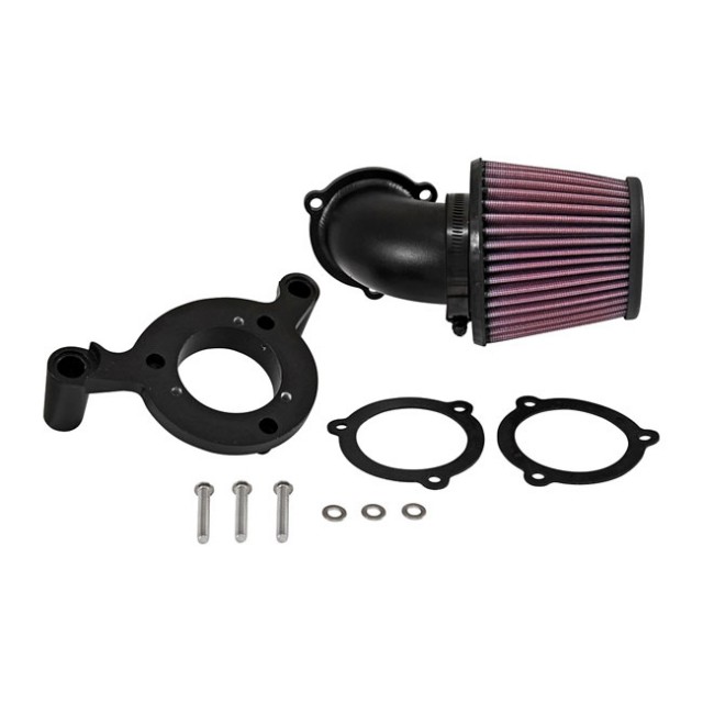 Leveres med et svart aluminiumsbend på 90° og en monteringsplate for gasspjeldhuset samt en svart stålfilter med K&N-logo.