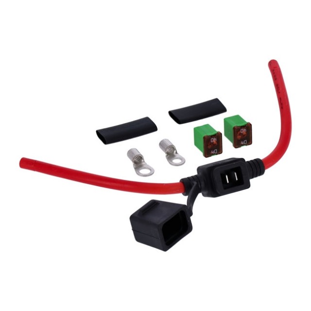Settet inneholder 1 kabel, 2 Kabelender, 2 krympestrømper, 1 innebygd sikringsholder og 2x 40A sikringer.