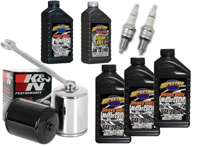 Inneholder 3x Spectro SAE 20/50 Motorolje, 1x Spectro Fullsyntetisk Girolje, 1x Spectro Primær Olje, 1x K&N Oljefilter i chrome, 2x Champion RN12YC Tennplugger og 3x O-ring for tappeplugg.