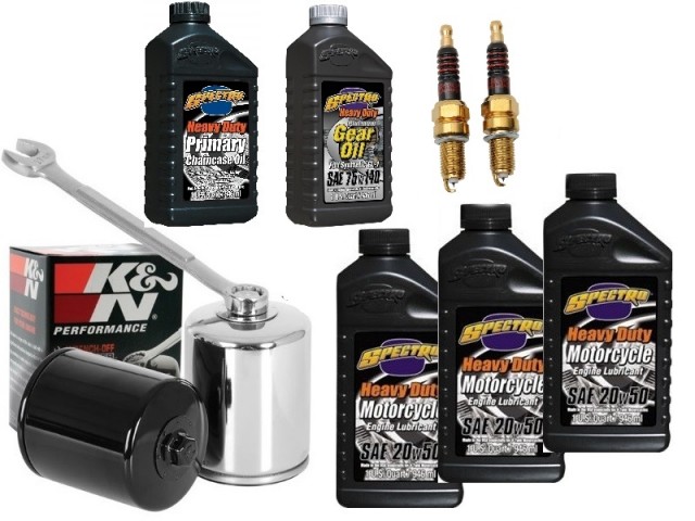 Passer Dyna modeller 1999-2017. Inneholder 3x Spectro SAE 20/50 motorolje, 1x Spectro Fullsyntetisk girolje, 1x Spectro Primær Olje, 1x K&N Oljefilter, 1x Drag Specialities Iridium tennplugg sett og 3x O-ring for tappeplugg.