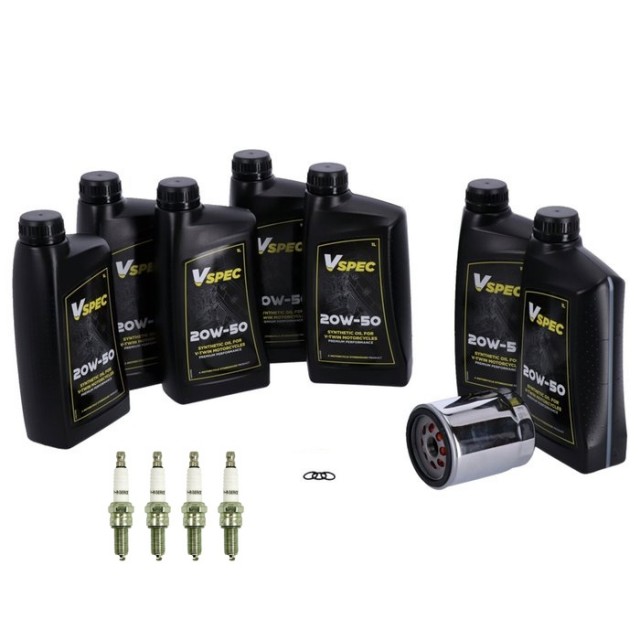 Våre Total Servicesett inneholder oljefilter i chrome, tennplugger, o-ringer til tappeplugger og nok kvalitets 20W50 helsyntetisk Vspec motorolje spesiell alt-i-ett løsning for bruk som motor, primær og girolje til å utføre service på den spesifikke modellene som er nevnt.