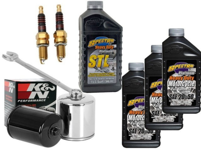 Inneholder 3x Spectro SAE 20/50 Fullsyntetisk motorolje, 1x Spectro Fullsyntetisk Primær/girolje, 1x K&N Oljefilter, 1x Drag Specialities Iridium tennplugg sett og 1x O-ring for tappeplugg. Passer Sportster modeller 1986-2022. Velg i svart eller chro