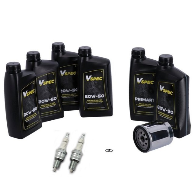 Våre Total Servicesett inneholder oljefilter i chrome, tennplugger, o-ringer til tappeplugger og nok Vspec syntetisk motor og girolje til å utføre service på den spesifikke modellene som er nevnt.