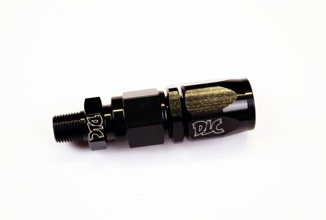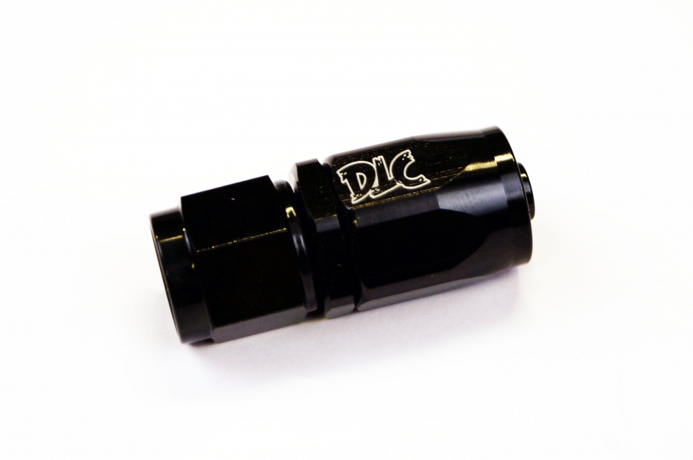 Black Magick rett svivel i sorteloksert aluminium med diskre DTC logo for bruk sammen med Black Magick oljeslanger.