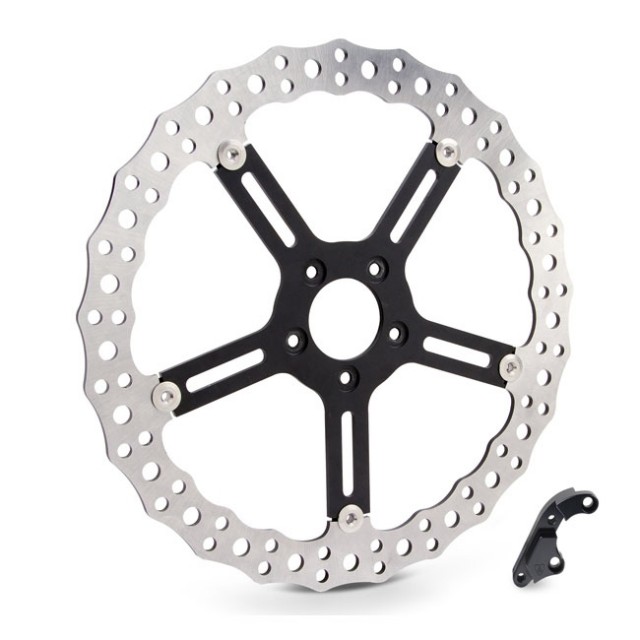 Settet inneholder en bremseskive og en bremscaliper adapter for å kompensere for rotorens diameter slik at standard bremsecaliperen kan gjenbrukes.