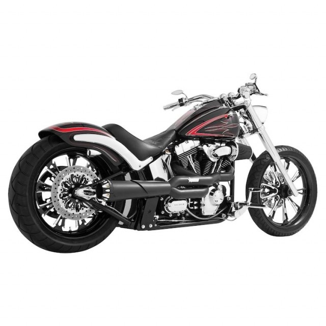 Passer Softail modeller 1984-2017 ( Passer ikke Rocker og Breakout ). Komplett eksosanlegg i svart med svart 4-1/2" konisk potte som har en billet aluminiums ende. Inkluderer varmeskiold, monteringsbrakett og festemateriell.