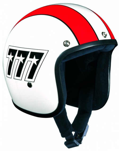 Bandit Jet halvhjelm (den som sitter fint på hodet) i blank hvit med rød striper og sort påskrift med teksten "777".
