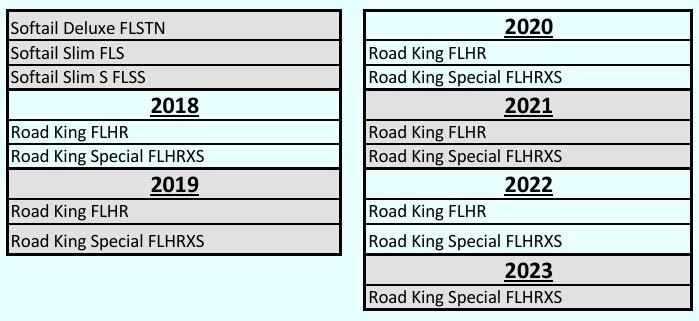 Passer Softail modeller 2011-2017, Road King modeller 2014-2022, FLHRXS Road King Special 2017-2024 og Dyna Wide Glide modeller 2012-2017. Kobles plug & play til eksisterende ledninger og er fullt kompatibel med sykkelens CAN-bus system. Trykk for info.