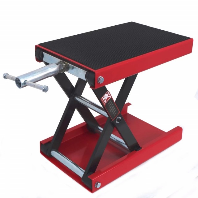 Praktisk MC jekk i høykvalitet stålkonstruksjon med gummipad for beskyttelse mot ramme.