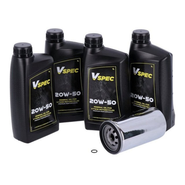 Grunnleggende servicesett med chrome oljefilter, O-ring til dreneringsplugg og nok motorolje til å utføre service på den spesifikke modellen som nevnt.