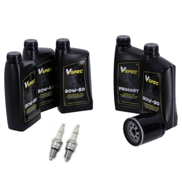 Våre Total Servicesett inneholder oljefilter i svart, tennplugger og nok Vspec syntetisk motor, gir og primærolje til å utføre service på den spesifikke modellene som er nevnt.