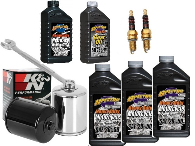 Inneholder 3x Spectro SAE 20/50 Fullsyntetisk Motorolje, 1x Spectro Fullsyntetisk Girolje, 1x Spectro Primær Olje, 1x K&N Oljefilter, 1x Drag Specialties Iridium Tennplugg Sett og 3x O-ring for tappeplugg.