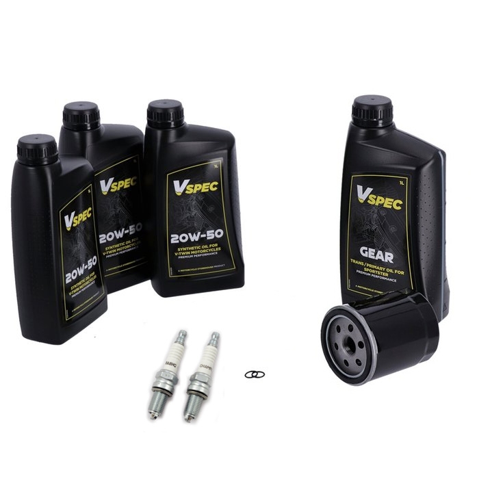 Passer Sportster modeller 1986-2022. Våre Total Servicesett inneholder oljefilter i svart, tennplugger, o-ringer til tappeplugger og nok Vspec syntetisk motor og girolje til å utføre service på den spesifikke modellene som er nevnt.