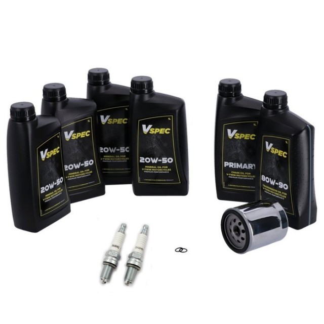 Våre Total Servicesett inneholder oljefilter i chrome, tennplugger, o-ringer til tappeplugger og nok Vspec motor, gir og primærolje til å utføre service på den spesifikke modellene som er nevnt.